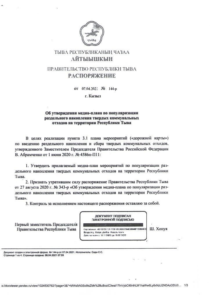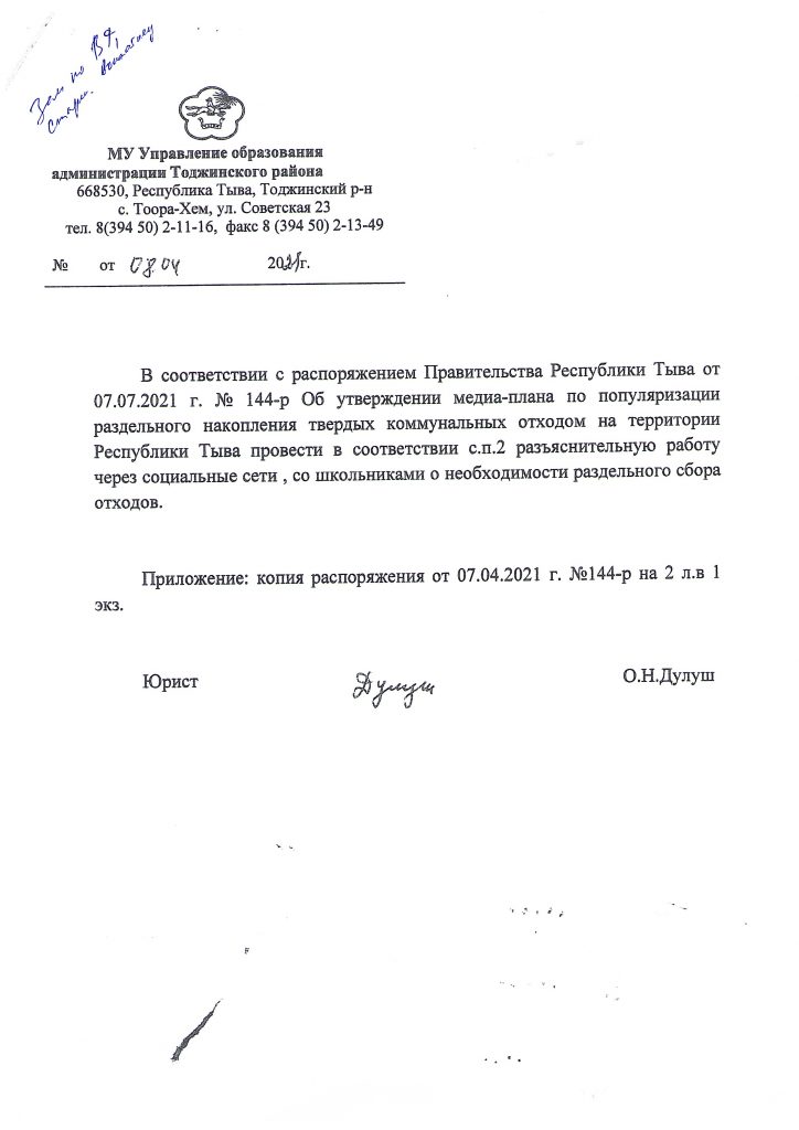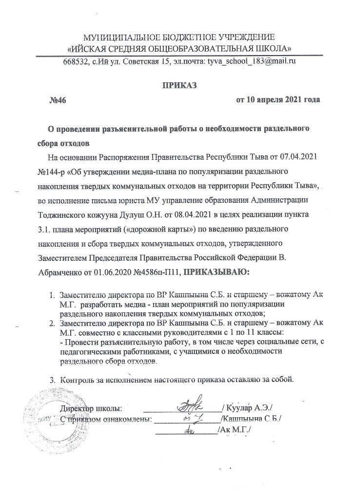 На основании Распоряжения Правительства Республики Тыва от 07.04.2021г. № 144-р «Об утверждении медиа-плана по популяризации раздельного накопления твердых коммунальных отходов на территории Республики Тыва» в МБУ Ийской СОШ была проведена разъяснительная работа о необходимости раздельного сбора отходов.