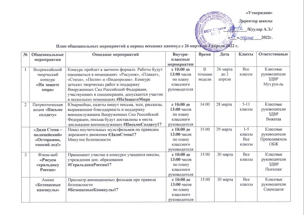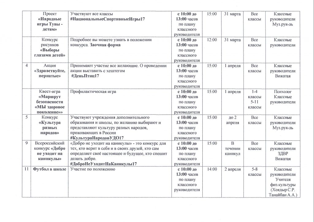 «Ура, весенние каникулы!» Приказ МОиН РТ от 18.03.2021г. №315-д «О назначении ответственных лиц по организации и проведению республиканской профилактической операции «Ура, весенние каникулы!» в образовательных организациях Республики Тыва» Приказ МУ Управление Образования Администрации ТР РТ от 19.03.2021г. №84 «О назначении ответственных лиц по организации и проведению профилактической операции «Ура, весенние каникулы!» в образовательных организациях Тоджинского района » План мероприятий на весенние каникулы МБУ Ийской СОШ с 24 по 31 марта 2025 годаСкачать График дежурства учителей с 24 по 31 марта 2025 годаСкачать