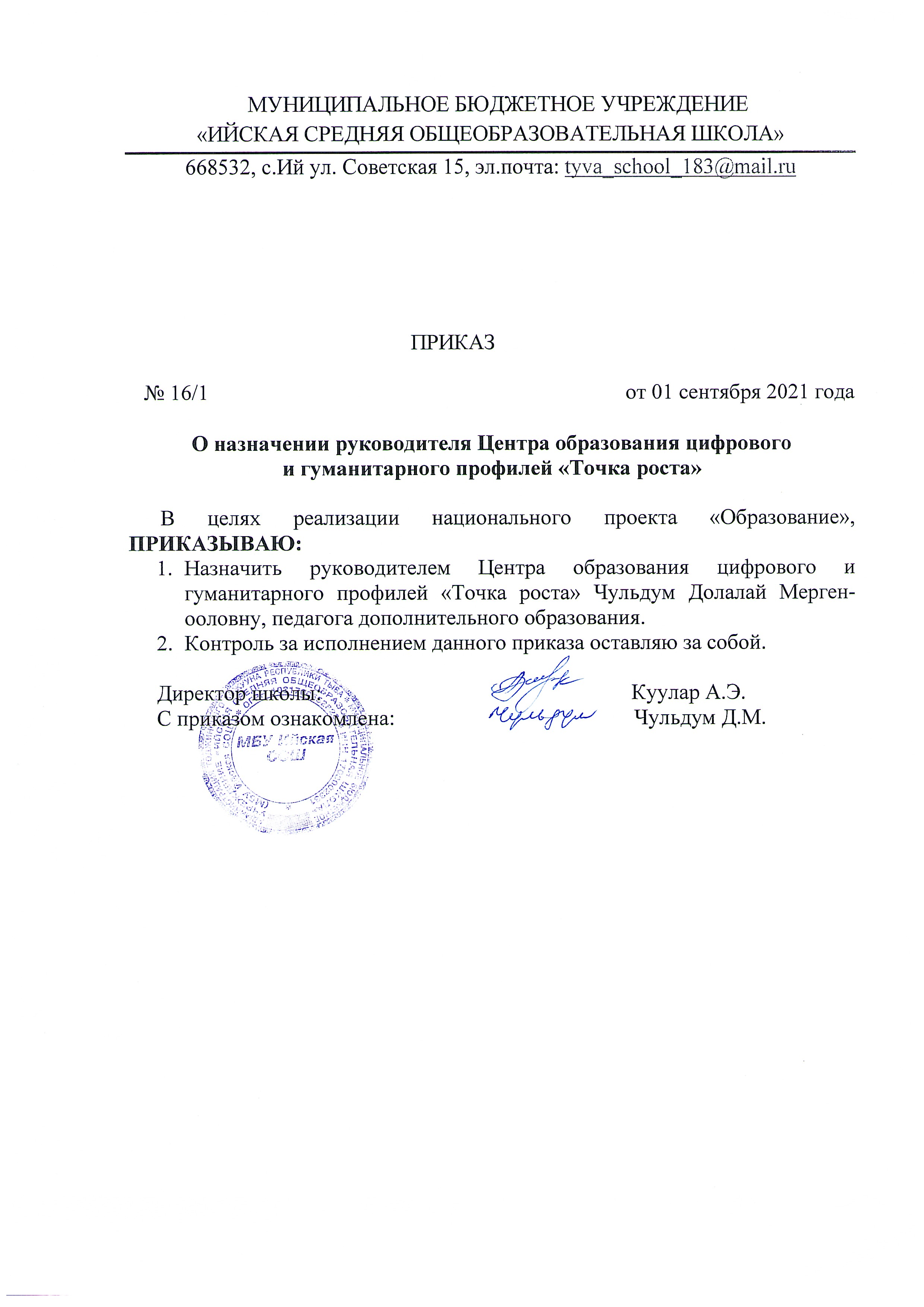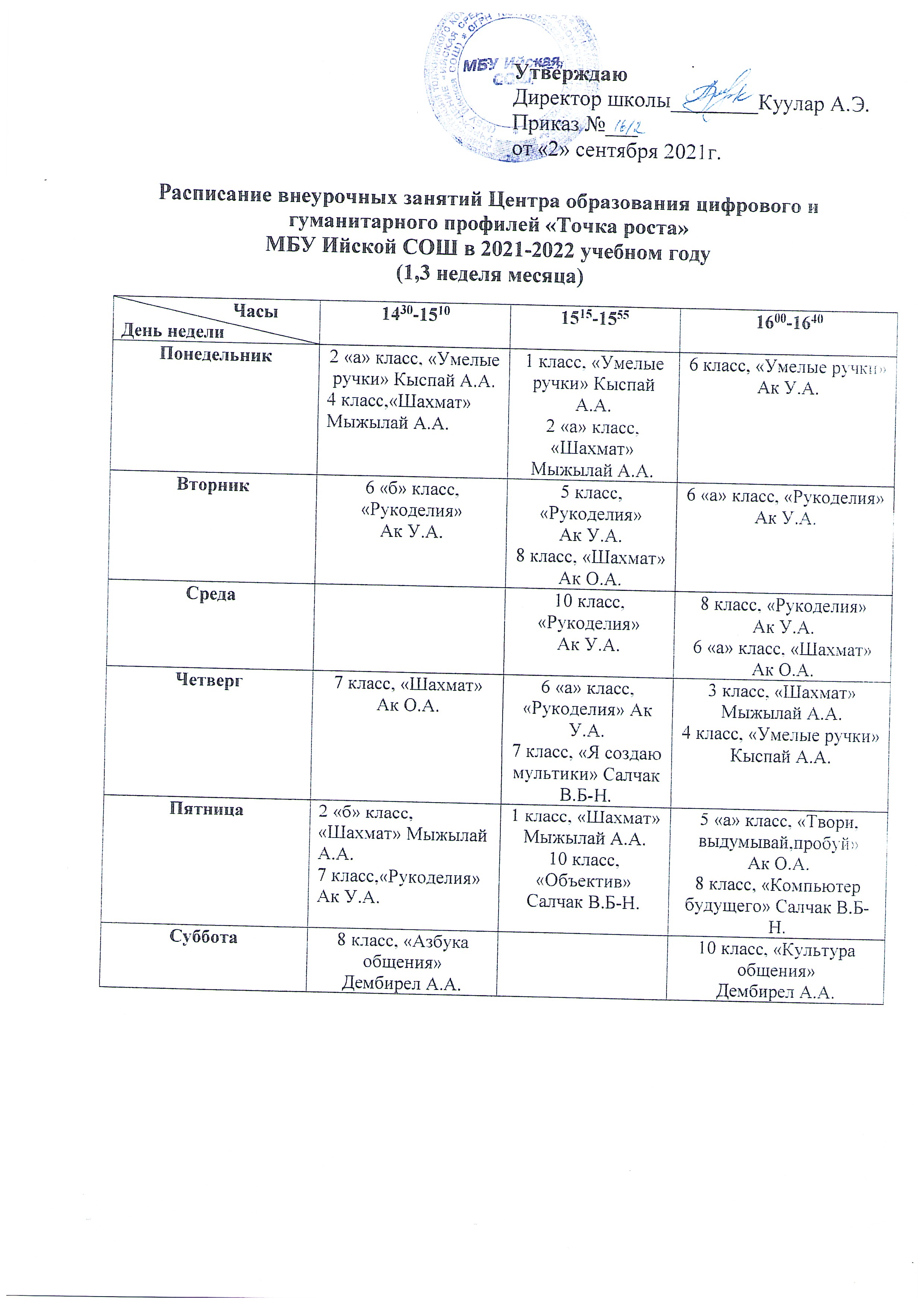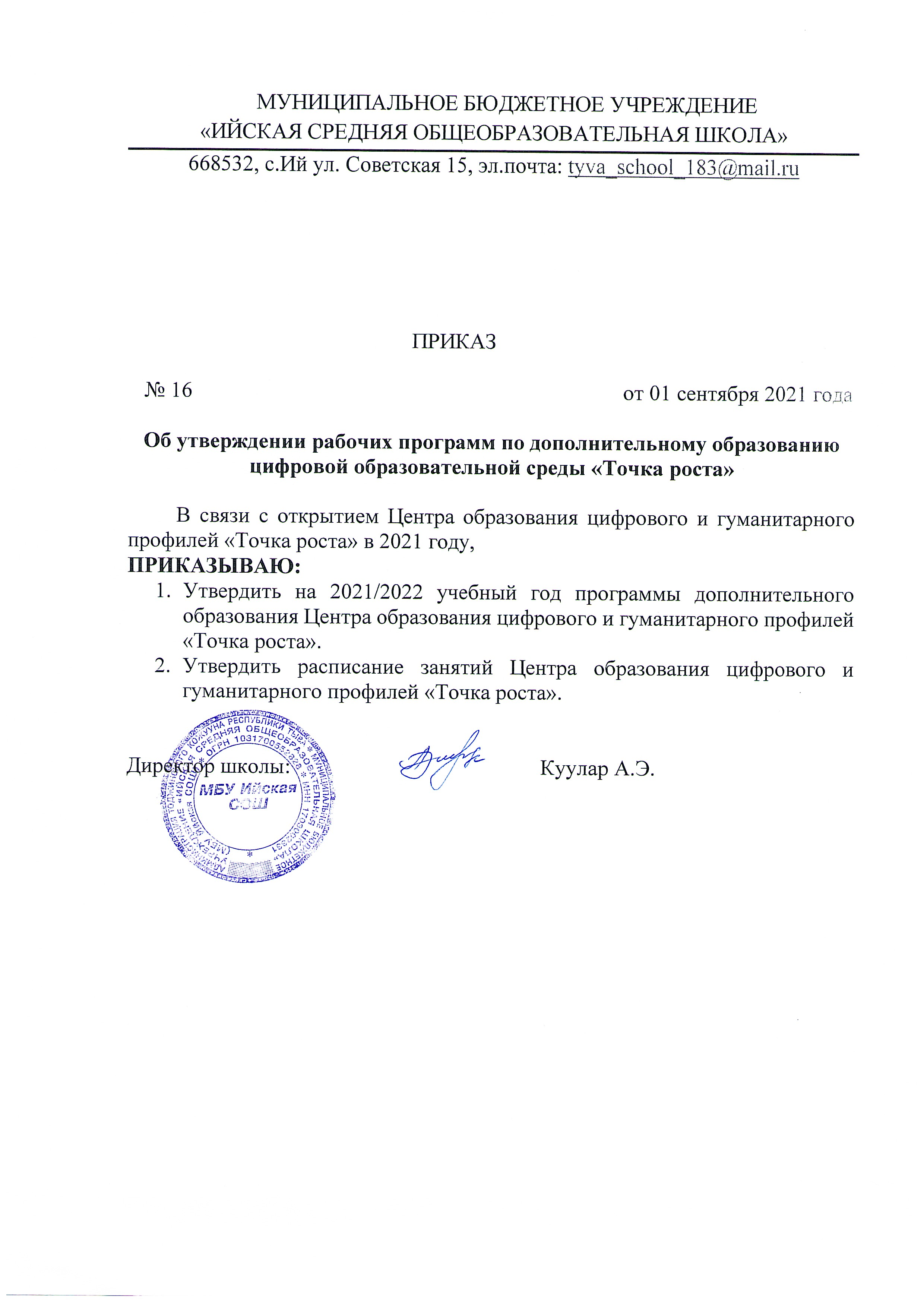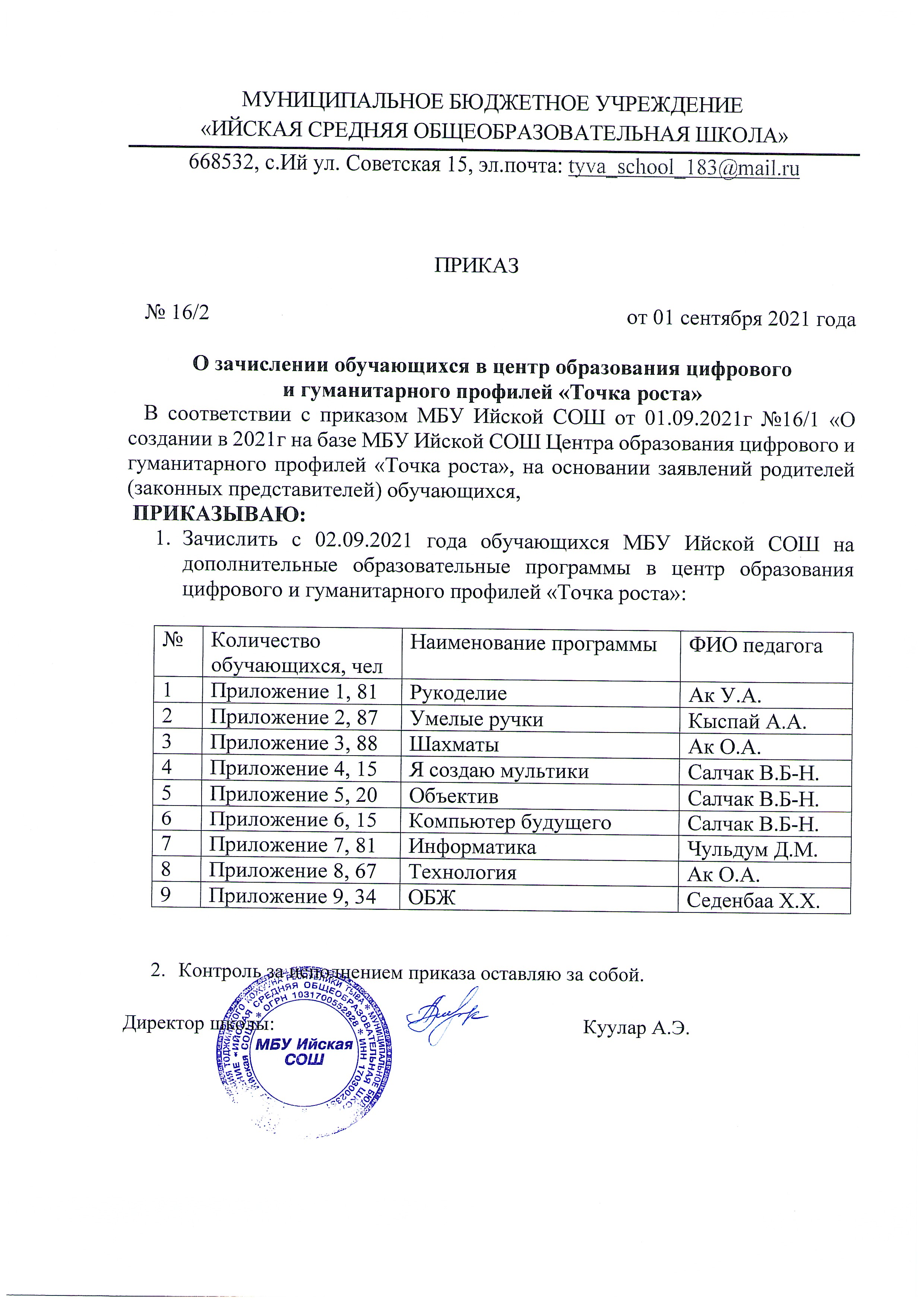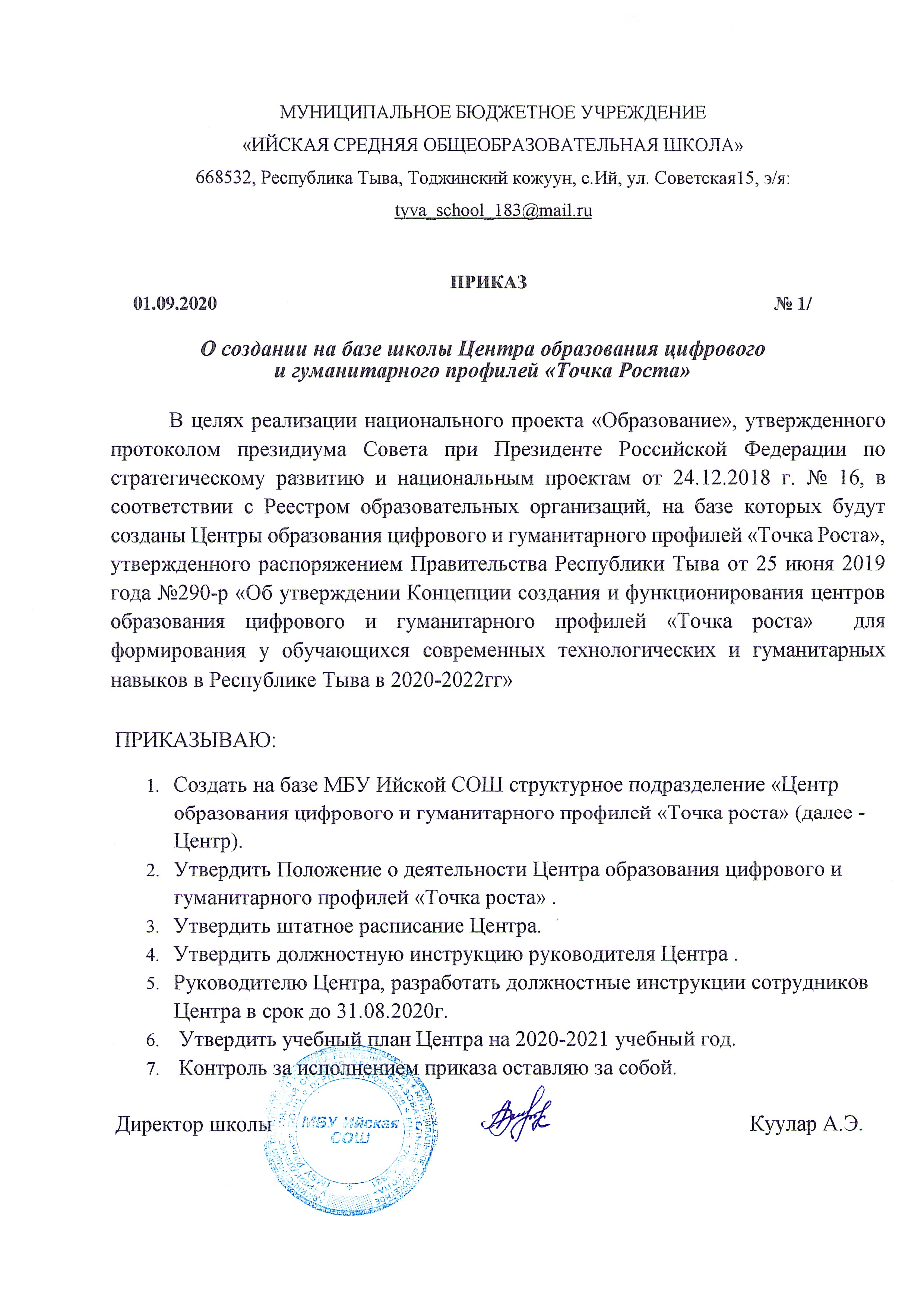 Центр образования цифрового и гуманитарного профилей «Точка роста» Приказ о создании Центра Точка роста (2) Приказ о назначении руководителя Центра Точка роста Приказ о назначении заведующих кабинетами Точка роста Приказ об утверждении рабочих программ по дополнительному образованию Точка роста Приказ о зачислении обучающихся в Центре Точка роста Отчет о работе Центра Точка роста в первое полугодие 2020-2021 уч год Информационно-аналитический отчет Точка роста за 2020-2021 уч год Дорожная карта по созданию и функционированию Точка роста при МБУ Ийская СОШ Положение о деятельности Центра Точка роста План Точка роста на 2021-2022 уч год Штатное расписание педагогов Центра точка роста Расписание занятий Центра Точка роста Расписание внеурочных занятий Центра Точка роста (1,3 неделя месяца) Расписание внеурочных занятий Центра Точка роста (2,4 неделя месяца) Опись кабинета Точка роста (информатика) Опись кабинета Точка роста (ОБЖ, технология)