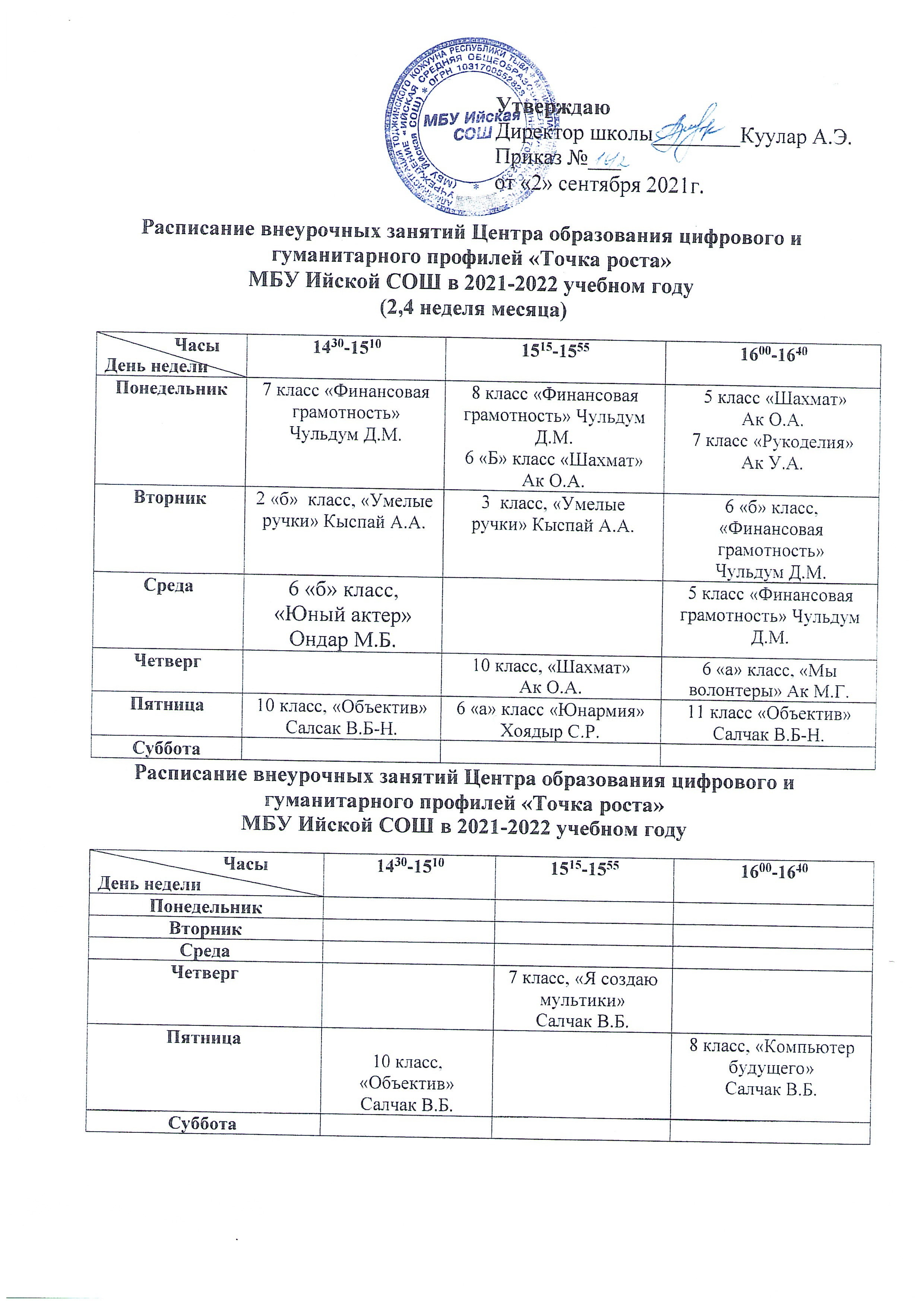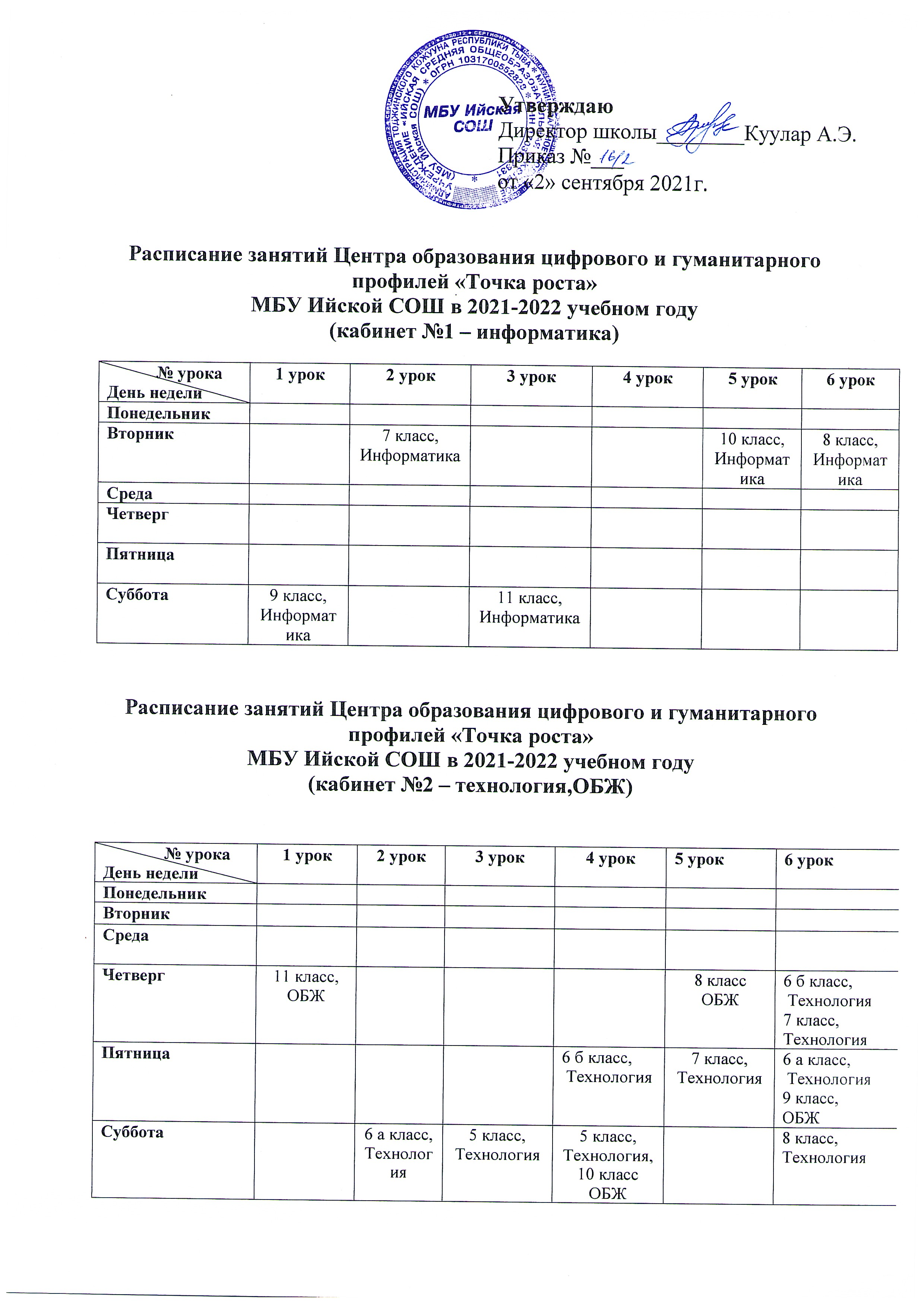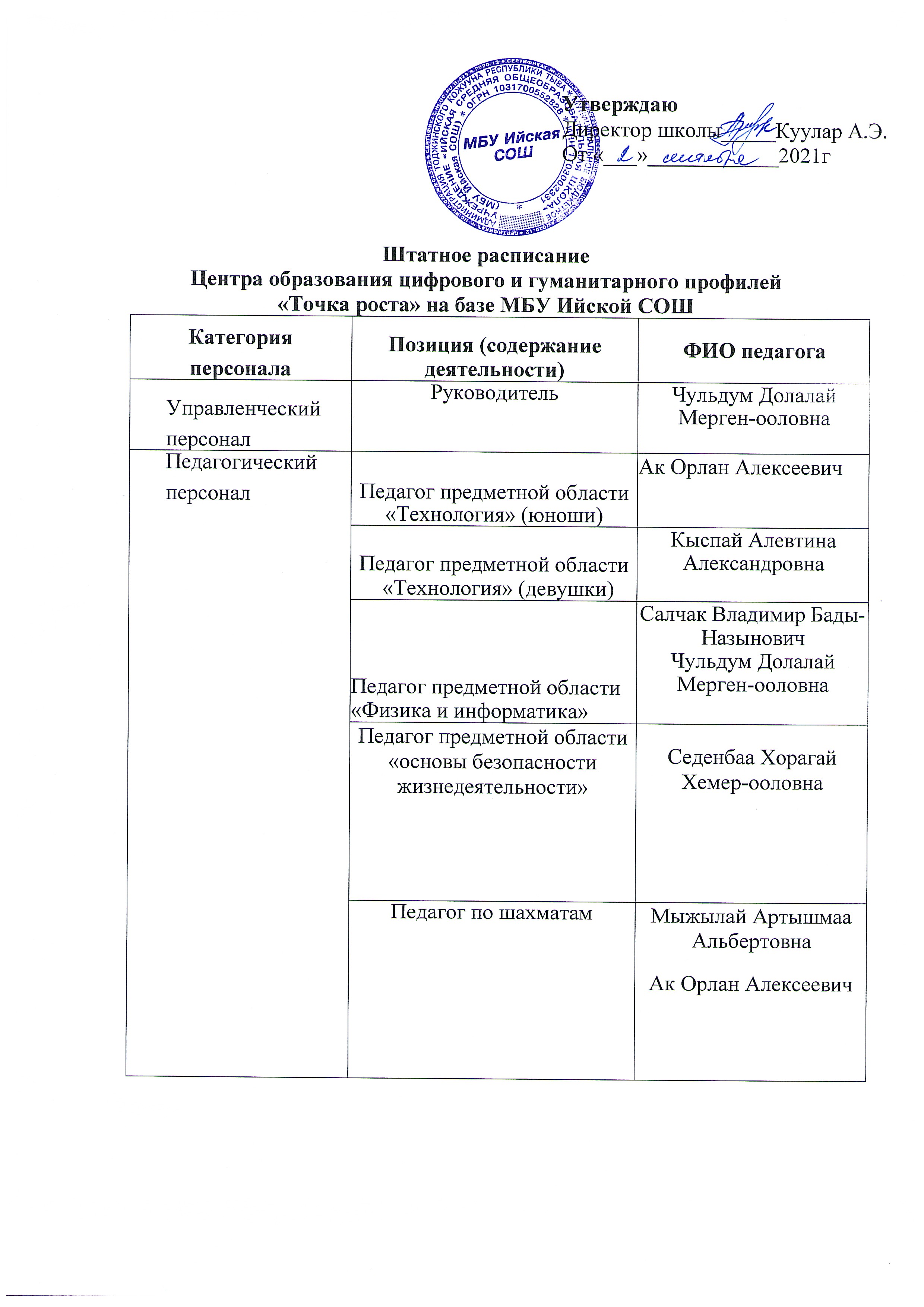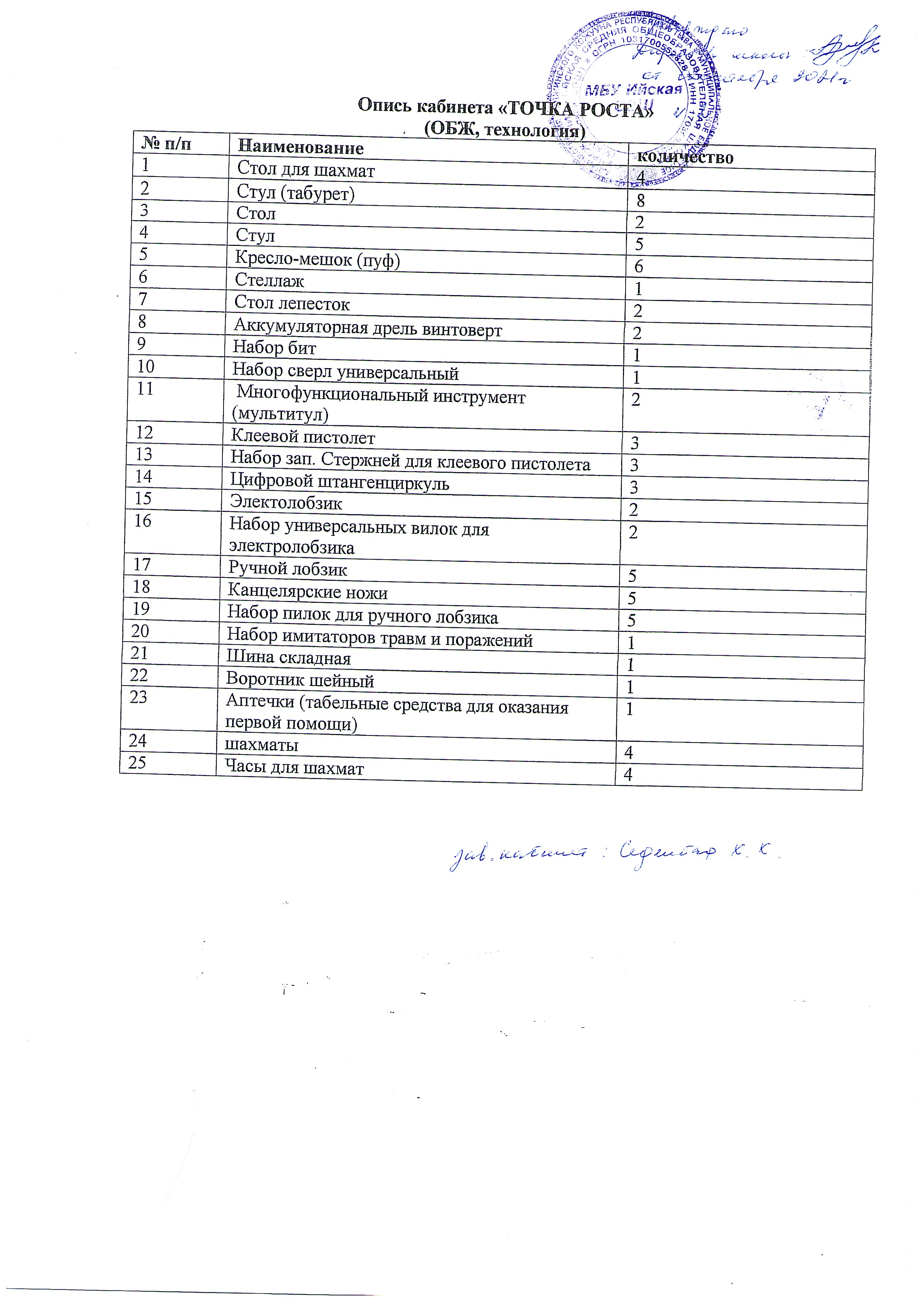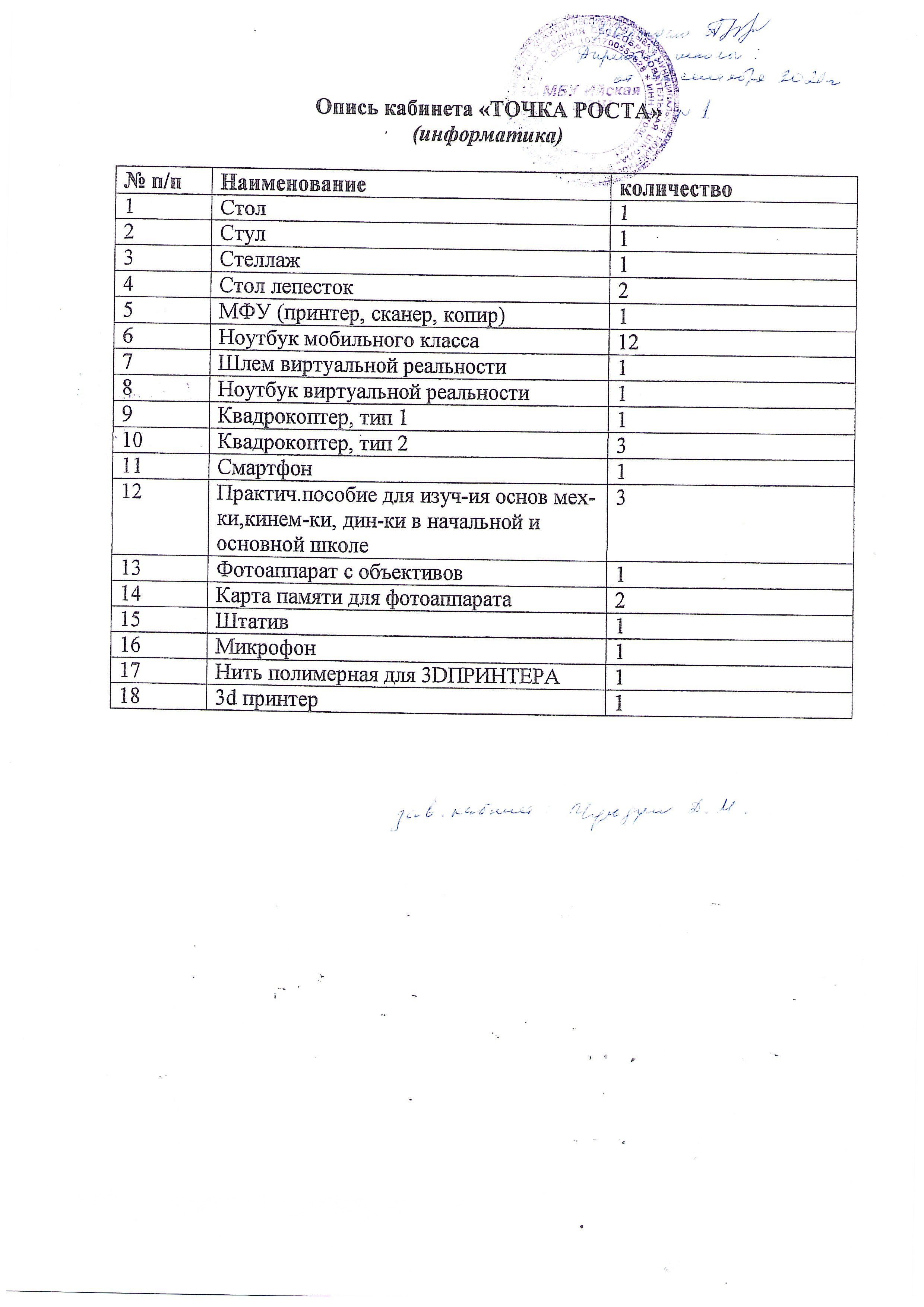 Центр образования цифрового и гуманитарного профилей «Точка роста» Приказ о создании Центра Точка роста (2) Приказ о назначении руководителя Центра Точка роста Приказ о назначении заведующих кабинетами Точка роста Приказ об утверждении рабочих программ по дополнительному образованию Точка роста Приказ о зачислении обучающихся в Центре Точка роста Отчет о работе Центра Точка роста в первое полугодие 2020-2021 уч год Информационно-аналитический отчет Точка роста за 2020-2021 уч год Дорожная карта по созданию и функционированию Точка роста при МБУ Ийская СОШ Положение о деятельности Центра Точка роста План Точка роста на 2021-2022 уч год Штатное расписание педагогов Центра точка роста Расписание занятий Центра Точка роста Расписание внеурочных занятий Центра Точка роста (1,3 неделя месяца) Расписание внеурочных занятий Центра Точка роста (2,4 неделя месяца) Опись кабинета Точка роста (информатика) Опись кабинета Точка роста (ОБЖ, технология)