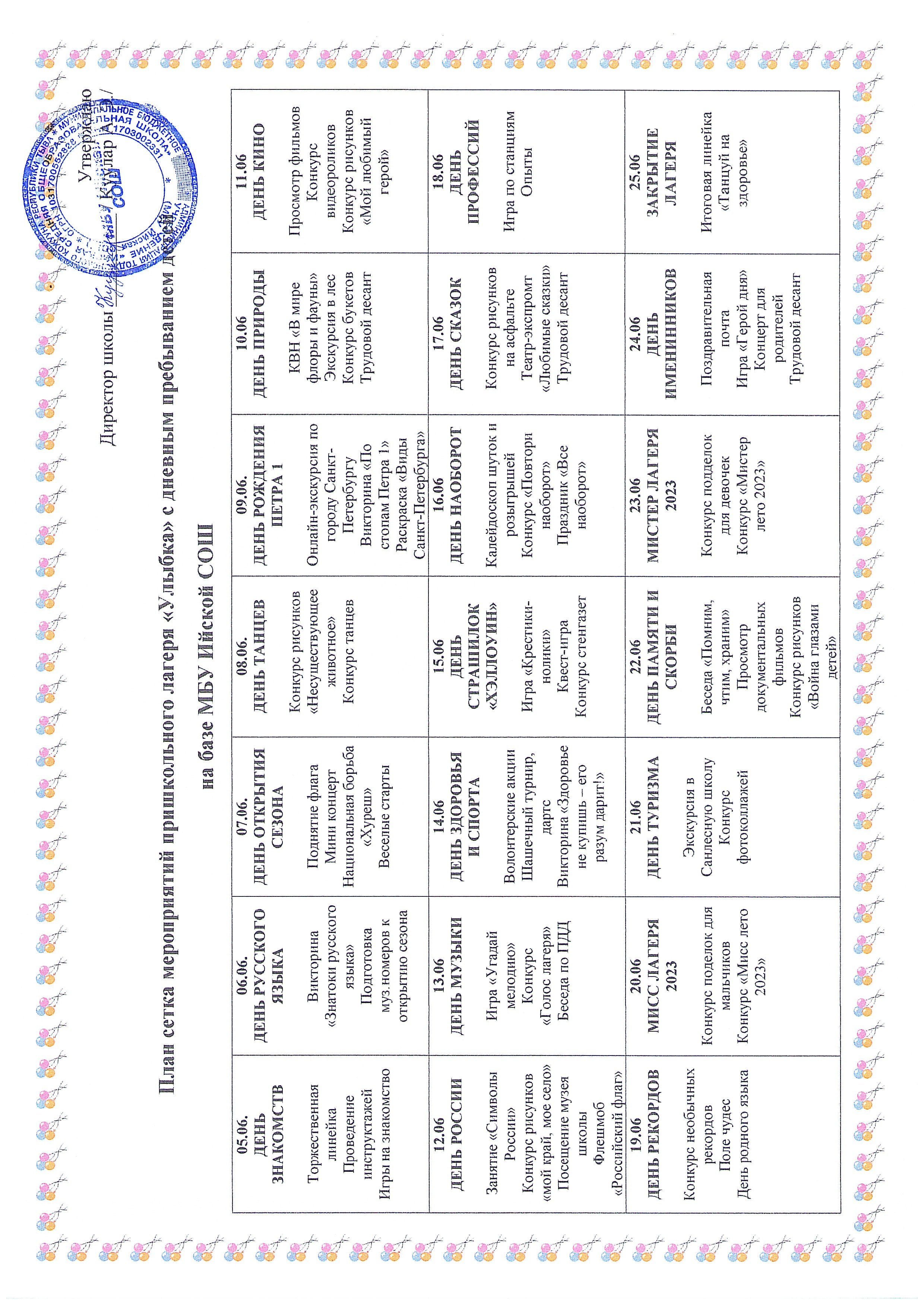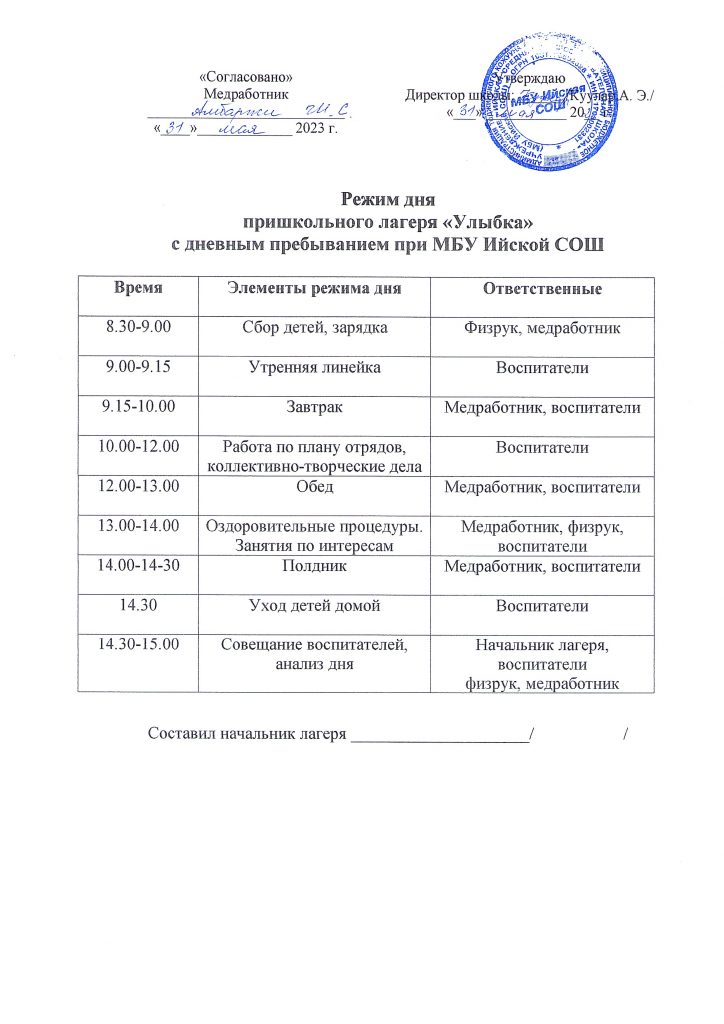 Пришкольный лагерь «Улыбка» Все фото на ВК https://vk.com/club217369296 Должностная инструкция начальника оздоровительного лагеря Должностная инструкция воспитателя ЛОЛ с дневным пребыванием МБУ Ийской СОШ Должностная инструкция физрука ЛОЛ Должностная инструкция повара ЛОЛ Должностная инструкция шеф-повара ЛОЛ Должностная инструкция кухонного работника лагеря Приказ о создании бракеражной комиссии Программа воспитания